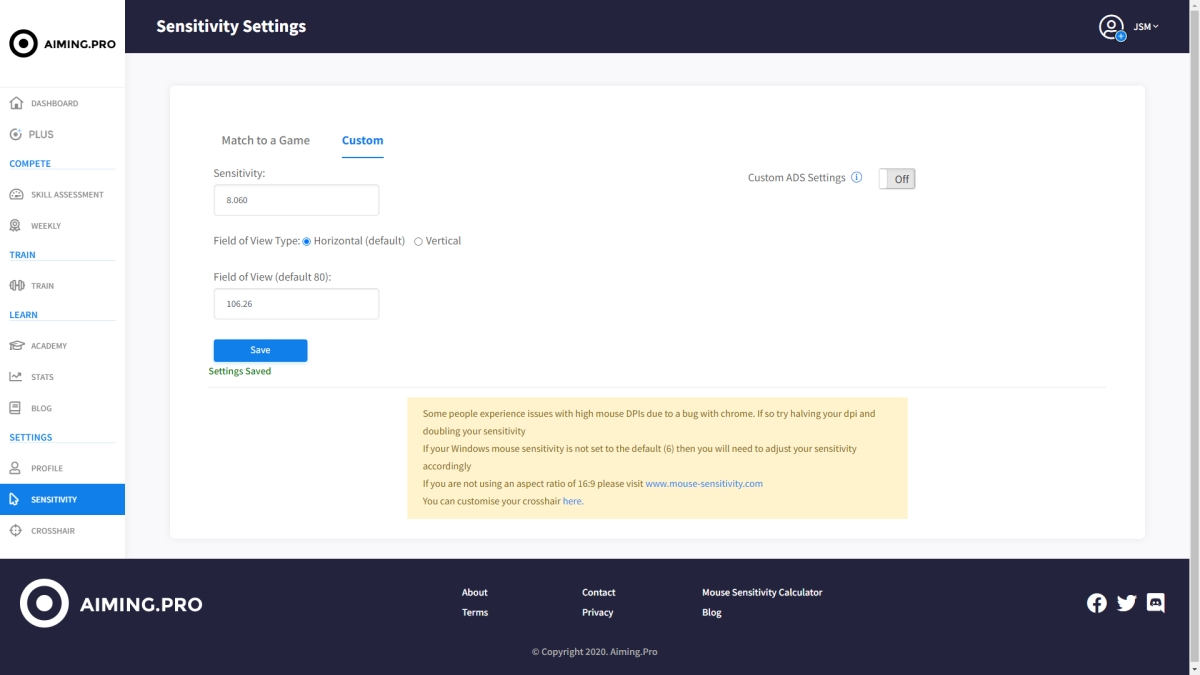 Head over to the Custom tab, and input your custom aiming.pro sensitivity directly into there. Lastly, input the same FOV as your main game of choice. Be sure to know the difference between 16:9, 4:3 and 1:1 FOV, as they all give different values to their actual degrees. For example, CSGO FOV is 90 - 4:3, which equals 106.26 - 16:9, which equals 73.74 - 1:1.