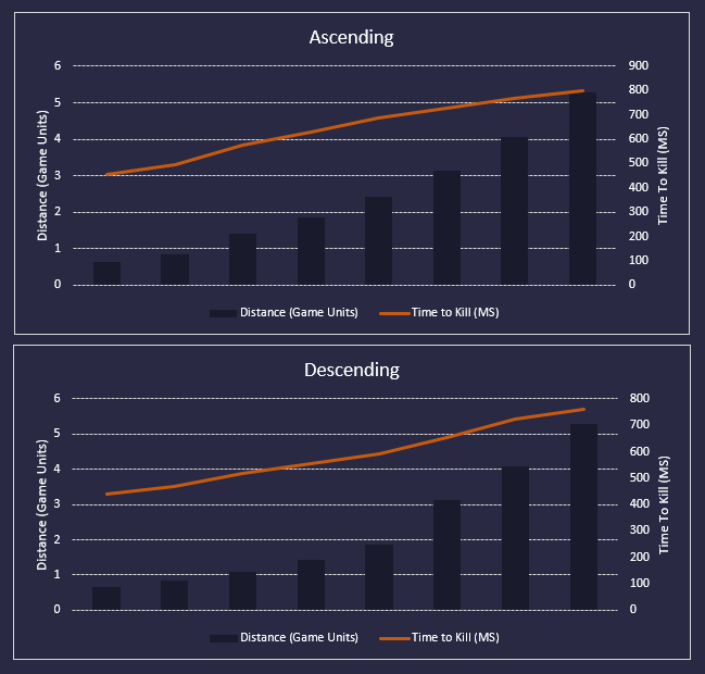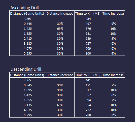 For the smallest distance increases, a distance change of 0.195 units resulted in 43 ms extra time to make the kill. Compare that to the larger distance increases, where a change of 1.22 units led to a 31 ms difference in shot time.