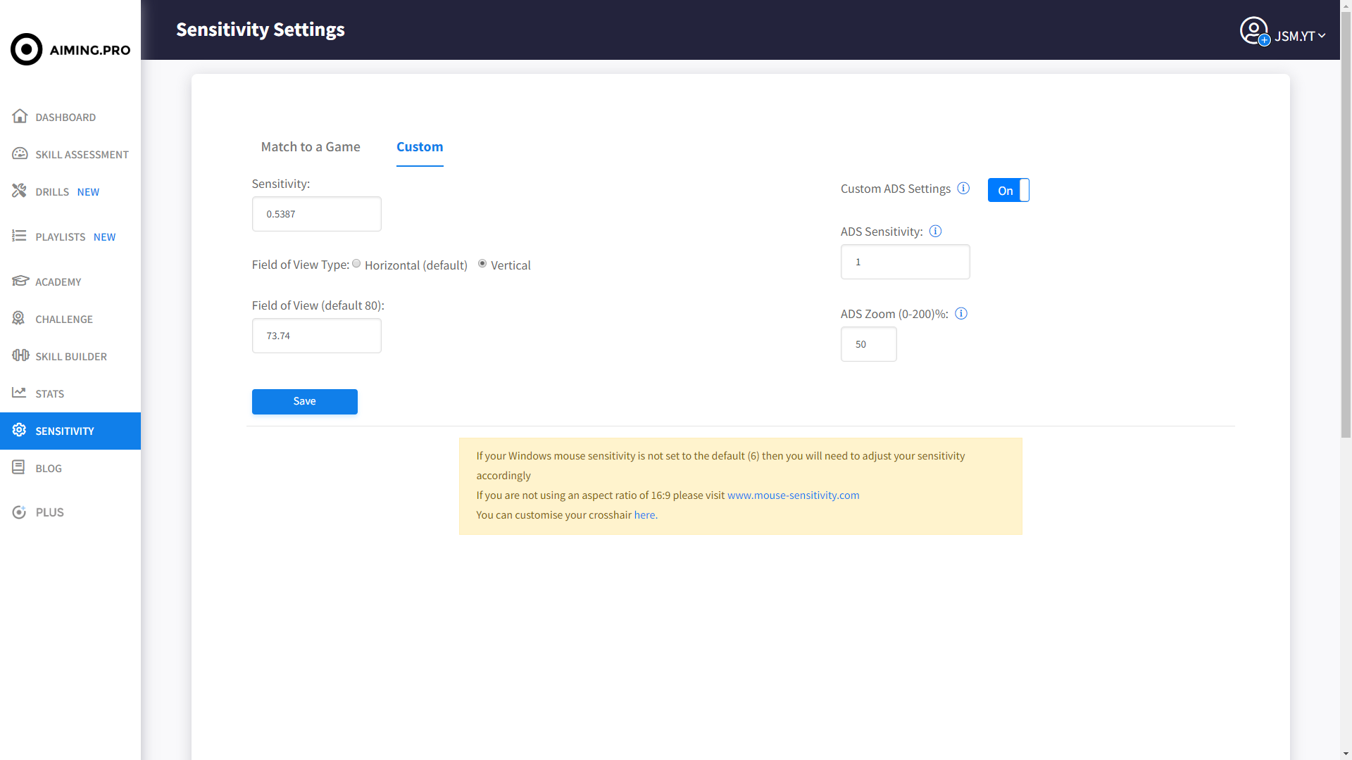 Aiming.Pro comes with a completely custom sensitivity calculator, featuring all of the lastest games. You can convert your in-game sensitivity of choice straight into Aiming.Pro. All you need to do is head to the Sensitivity category on the page and find your game of choice form the dropdown menu. then, type in the sensitivity you prefer to play on and let the calculator do the work for you. You will get your Aiming.Pro sensitivity in the output box.