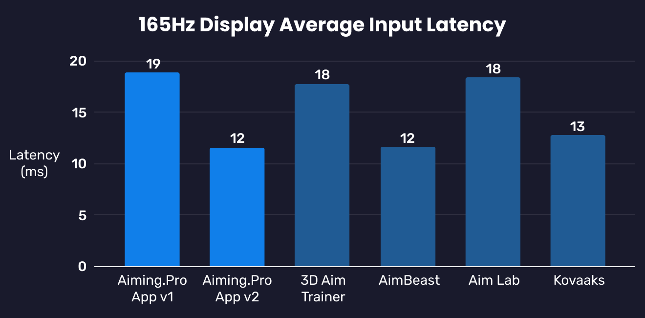 As you can see, before the most recent update, the Aiming.Pro desktop app was lagging fractions of a second behind some of the other aim trainers but with this new update, we’ve achieved 2.2x better latency on a 60hz monitor and 1.5x faster on a 165Hz monitor.
